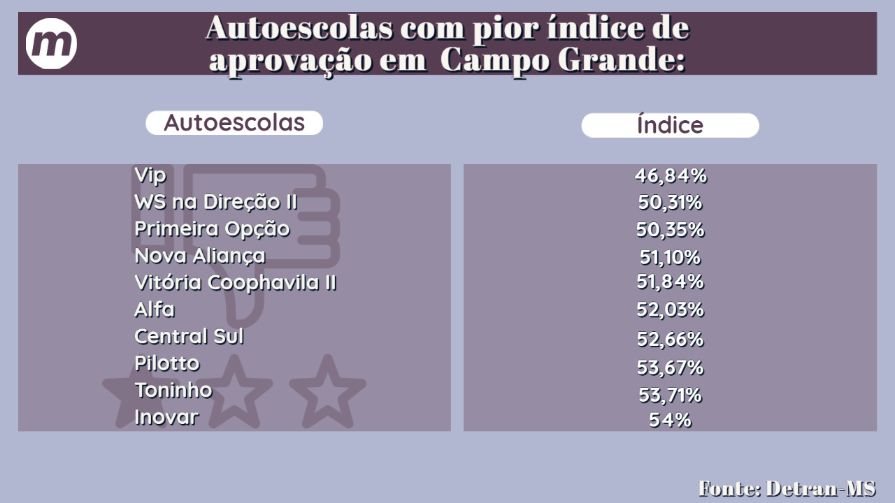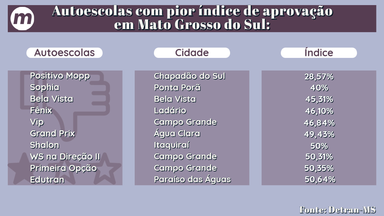 Conforme dados do Detran-MS, as autoescolas com pior índice de aprovação em Mato Grosso do Sul são: