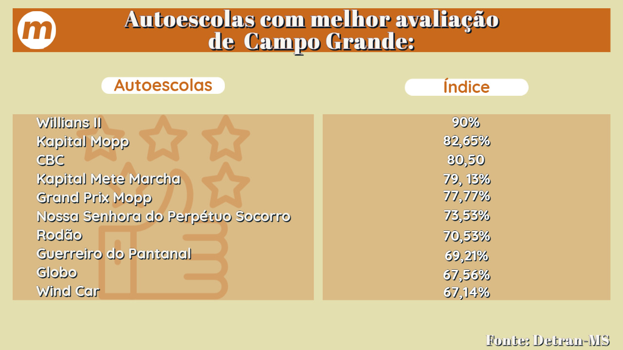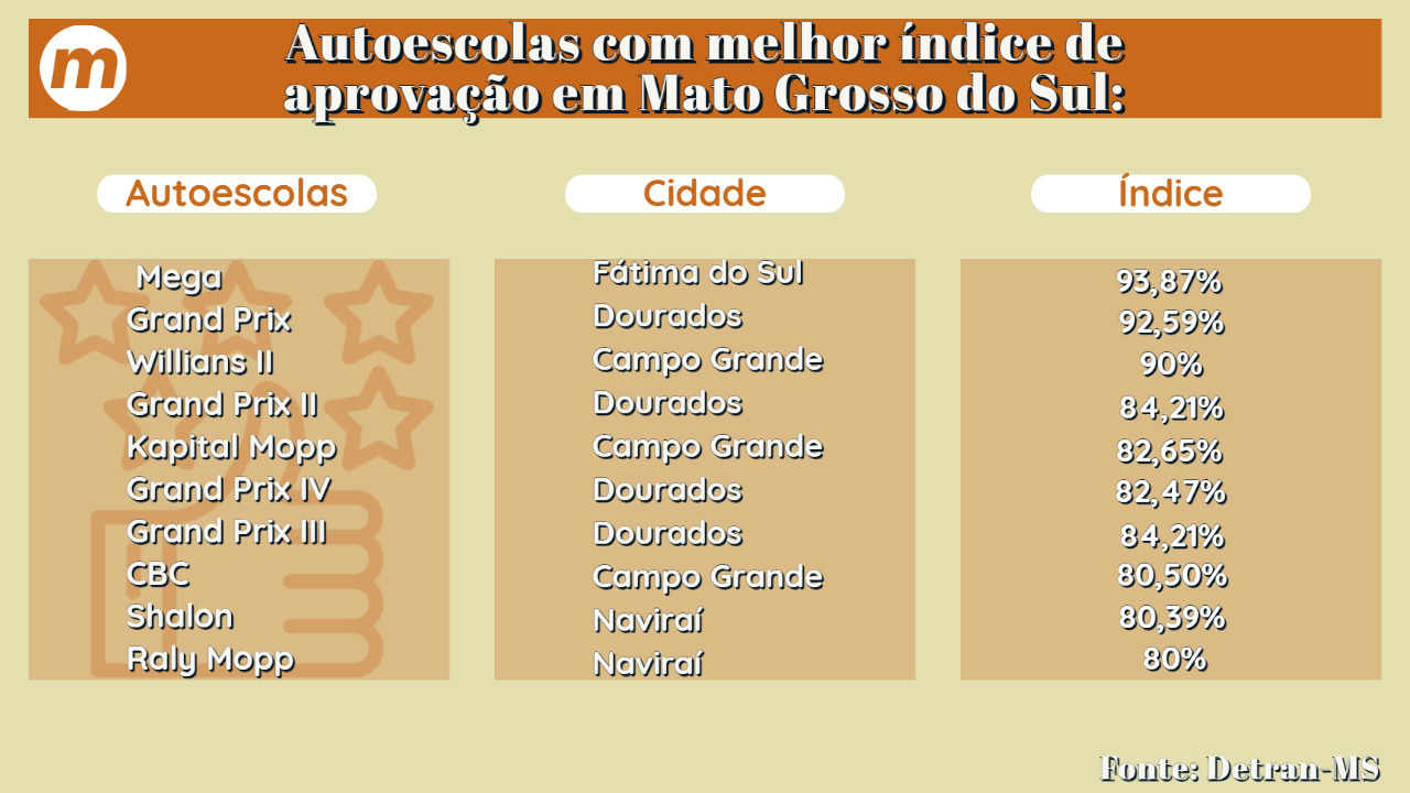 Excluindo as autoescolas específicas para militares ou pessoas que já sabem dirigir, as empresas com maior índice de aprovação em Mato Grosso do Sul são:
