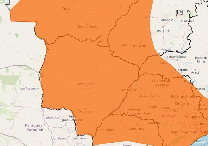 Todas as cidades de Mato Grosso do Sul estão no alerta do Inmet (Instituto Nacional de Meteorologia) para risco da onda de calor e baixa umidade do ar. Nesta terça-feira (19), as temperaturas devem ficar 5°C mais altas que o normal para o período.