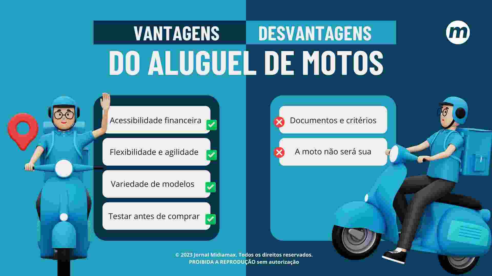 O aluguel de motos pode ser feito para períodos curtos, como dias ou semanas, ou para períodos mais extensos, com planos mensais ou anuais. Magnus Codorniz Cruz, 43, é gerente da TeraX Moto Aventura. Segundo ele, a grande vantagem para o consumidor que opta pelo aluguel da moto é a possibilidade de obter um veículo novo sem se preocupar com despesas de manutenção, seguro e imposto.