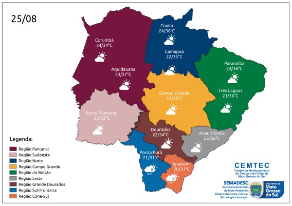 Em Corumbá, na região pantaneira, a mínima será de 23°C e máxima de 36°C; Aquidauana terá variação entre 24°C e 34°C. No sudoeste, Porto Murtinho amanhece com 23°C e atinge os 33°C. No norte, Coxim terá 24°C cedo e alcançará os 36°C ao longo do dia. No Bolsão, Três Lagoas registra 21°C pela manhã e 36°C de tarde.