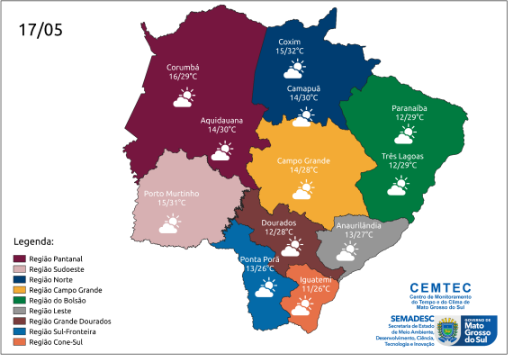 Para a região norte, é esperado mínima entre 10 e 15°C e máxima de 33°C. Em Campo Grande, mínima entre 13-15°C e máxima de 29°C.
