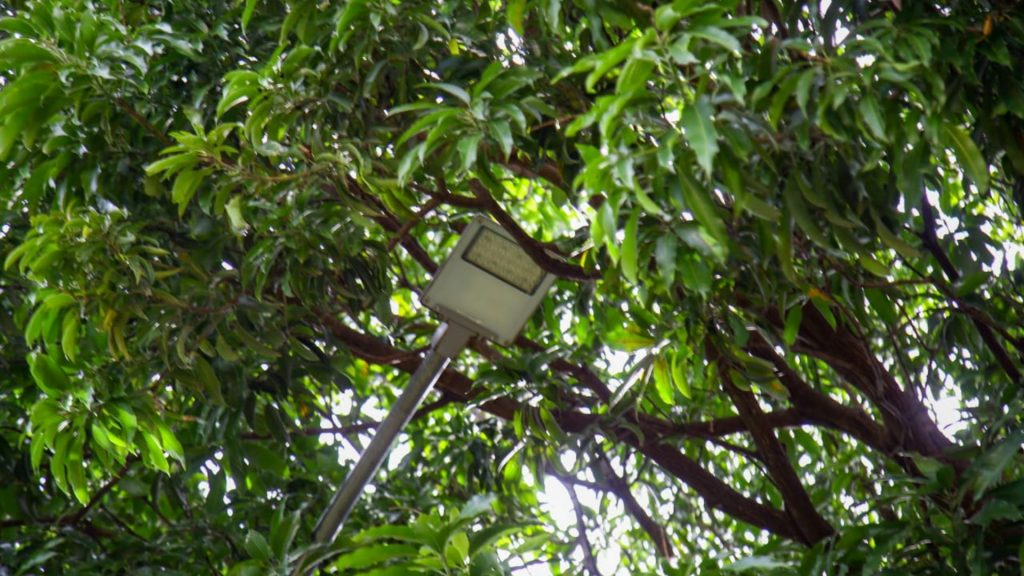 Isso porque as árvores, importantes para o meio ambiente e para a cidade como um todo, estão ‘engolindo’ os postes de iluminação pública e deixando um breu no local durante a noite.