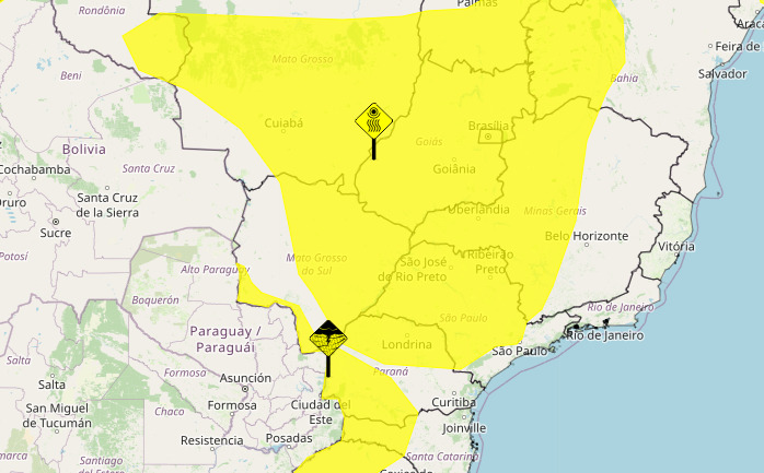 Estão no aviso: Água Clara, Alcinópolis, Anastácio, Anaurilândia, Angélica, Aparecida do Taboado, Aquidauana, Bandeirantes, Bataguassu, Batayporã, Brasilândia, Caarapó, Camapuã, Campo Grande, Cassilândia, Chapadão do Sul, Corguinho, Corumbá, Costa Rica, Coxim, Deodápolis, Dois Irmãos do Buriti, Douradina, Dourados, Fátima do Sul, Figueirão, Glória de Dourados, Inocência, Itaporã, Itaquiraí, Ivinhema Jaraguari, Jateí, Juti, Maracaju, Naviraí, Nioaque, Nova Alvorada do Sul, Novo Horizonte do Sul, Paraíso das Águas, Paranaíba, Pedro Gomes, Ribas do Rio Pardo, Rio Brilhante, Rio Negro, Rio Verde de Mato Grosso, Rochedo, Santa Rita do Pardo e São Gabriel do Oeste.