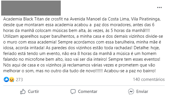 “Academia Black Titan de Crossfit na Avenida Manoel da Costa Lima, Vila Piratininga, desde que montaram essa academia acabou a paz dos moradores, antes das 6 horas da manhã colocam músicas bem alta, às vezes, às 5 horas da manhã!”, relatou a mulher na postagem feita no último dia 21, no Feriado de Tiradentes.