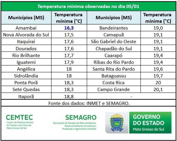 Nesta quinta-feira (5), a menor temperatura de Mato Grosso do Sul foi de 16,3ºC em Amambai. Nova Alvorada do Sul vem em seguida com 17,5ºC e Itaquiraí com 17,6ºC. Os termômetros na Capital atingiram 20,1ºC.