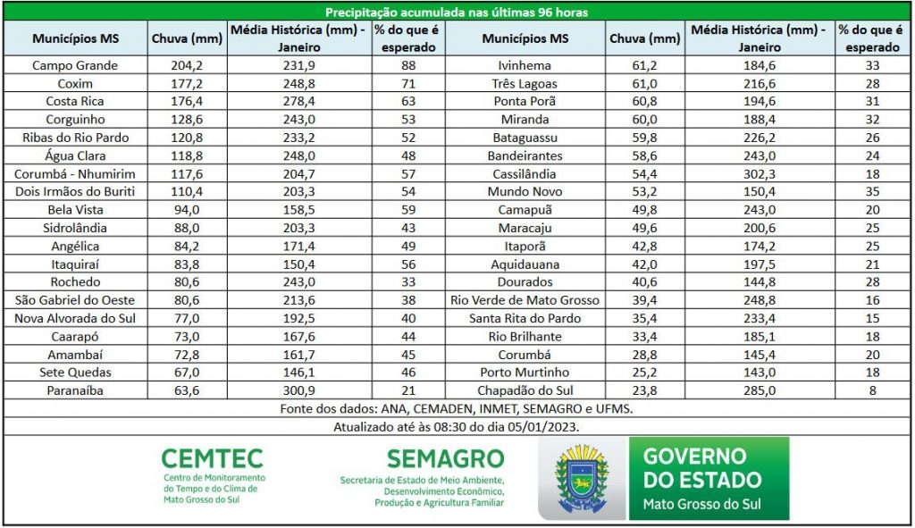 No total, nove municípios sul-mato-grossenses superaram em 96 horas pelo menos metade da média histórica de janeiro e oito ultrapassaram os 100 mm de chuva.