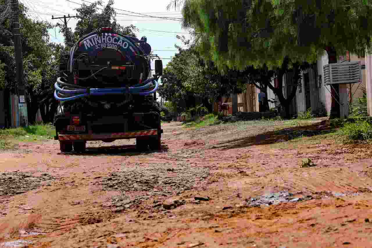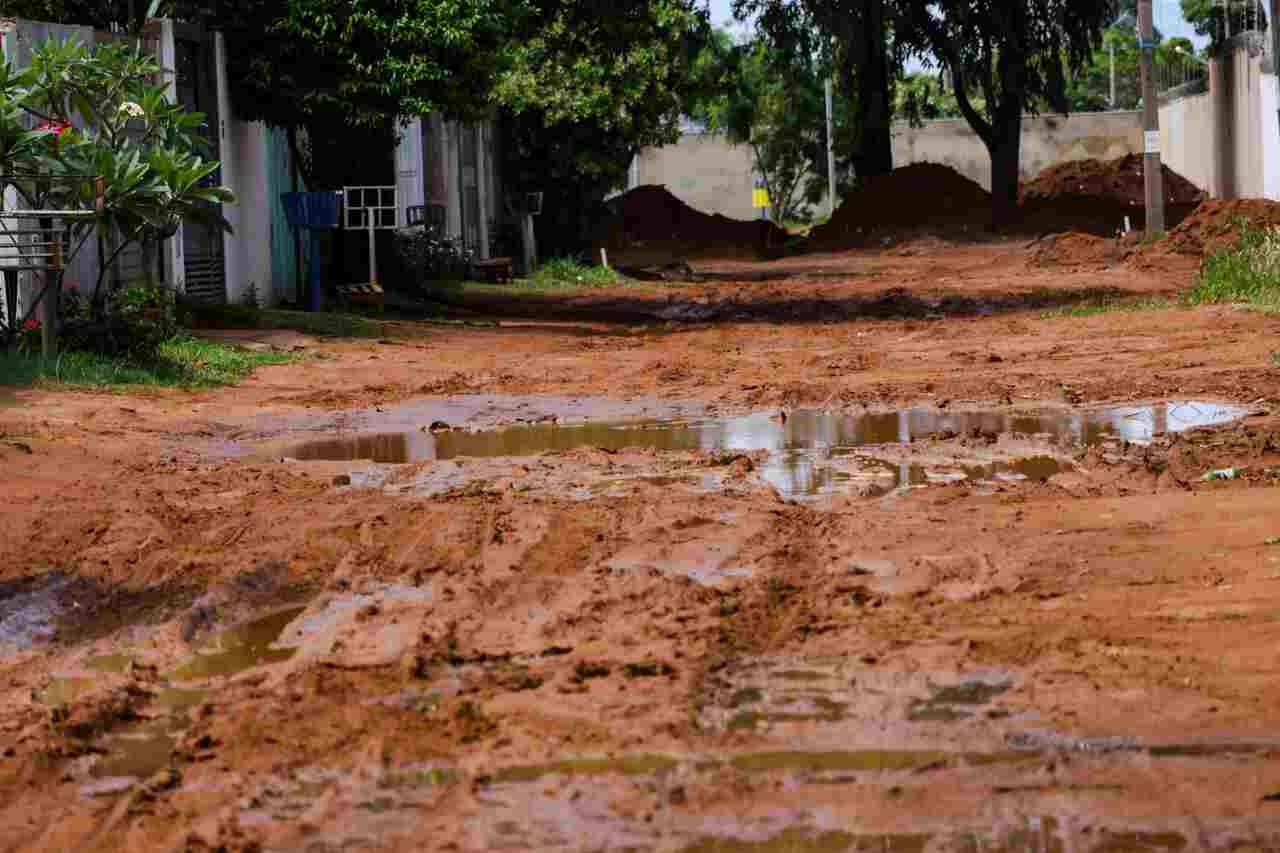 A falta de esgoto e água acumulada nas vias escancara um segundo problema, que para os moradores é ainda mais grave. A falta de asfalto causa transtorno em dias de chuva e também nas épocas de seca, gerando barro e poeira ao longo de todo o ano.