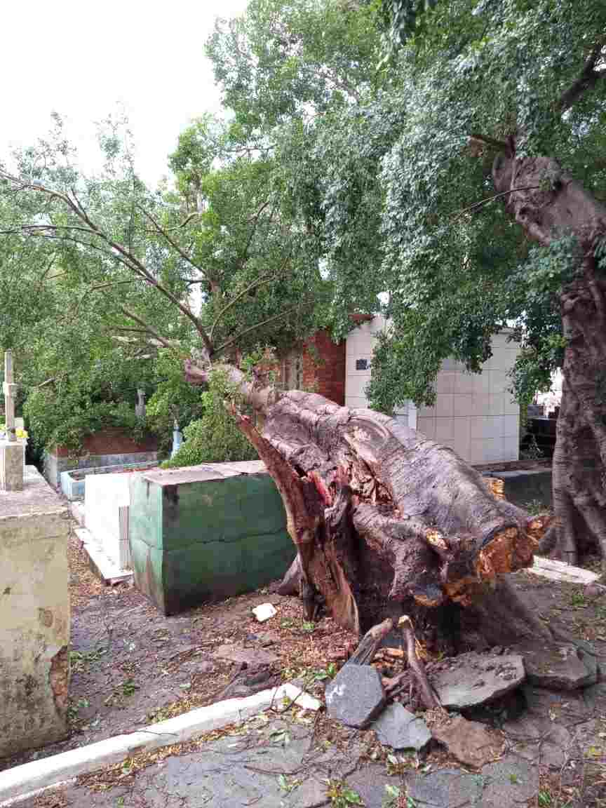 As dezenas de árvores que caíram no local atingiram as estruturas do cemitério, como esculturas e monumentos.