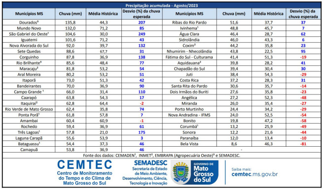 As chuvas do mês de agosto que causaram destruições em municípios de Mato Grosso do Sul, ficaram acima da média histórica, na maior parte do estado. Dourados foi o município com maior precipitação, apresentando um acumulado de chuva de 135,8 mm. Em Campo Grande, foi registrada precipitação de 66 mm, representando 110% acima da média histórica. Dados são do CEMTEC (Centro de Monitoramento do Tempo e do Clima de Mato Grosso do Sul).