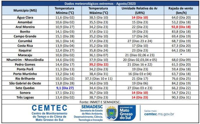 A menor umidade do ar registrada no estado, em agosto, foi de 14%, em Água Clara e Sonora, no dia 10, e em Três Lagoas, no dia 23. A maior rajada de vento observada foi de 92,8 km/h no município de Aral Moreira no dia 18.