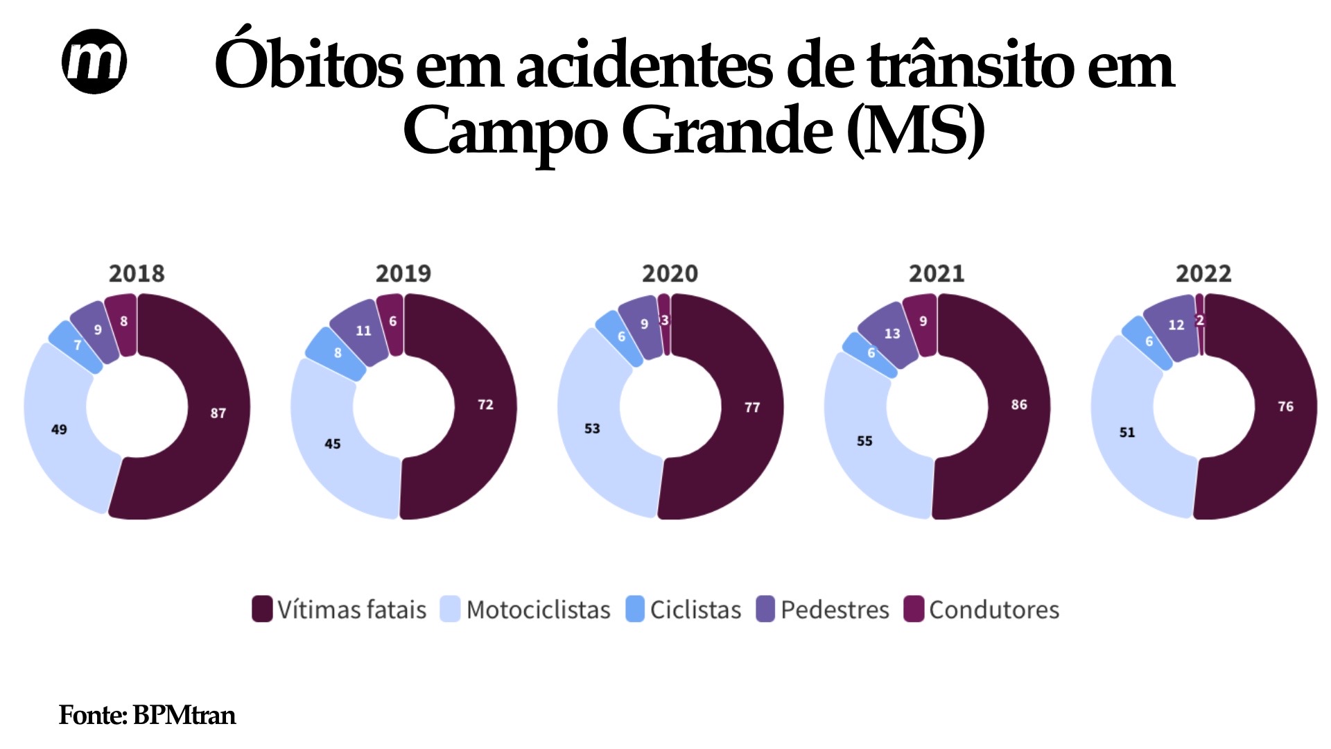 Motocicleta (43,4%) e automóvel (31,2%) lideram a lista de tipos de veículos envolvidos em acidentes com óbitos em Mato Grosso do Sul. Campo Grande (204) e Dourados (59) foram as cidades com mais vítimas fatais. A Capital representa quase um terço do total de 695 mortes registradas no Estado entre 2018 e 2022.