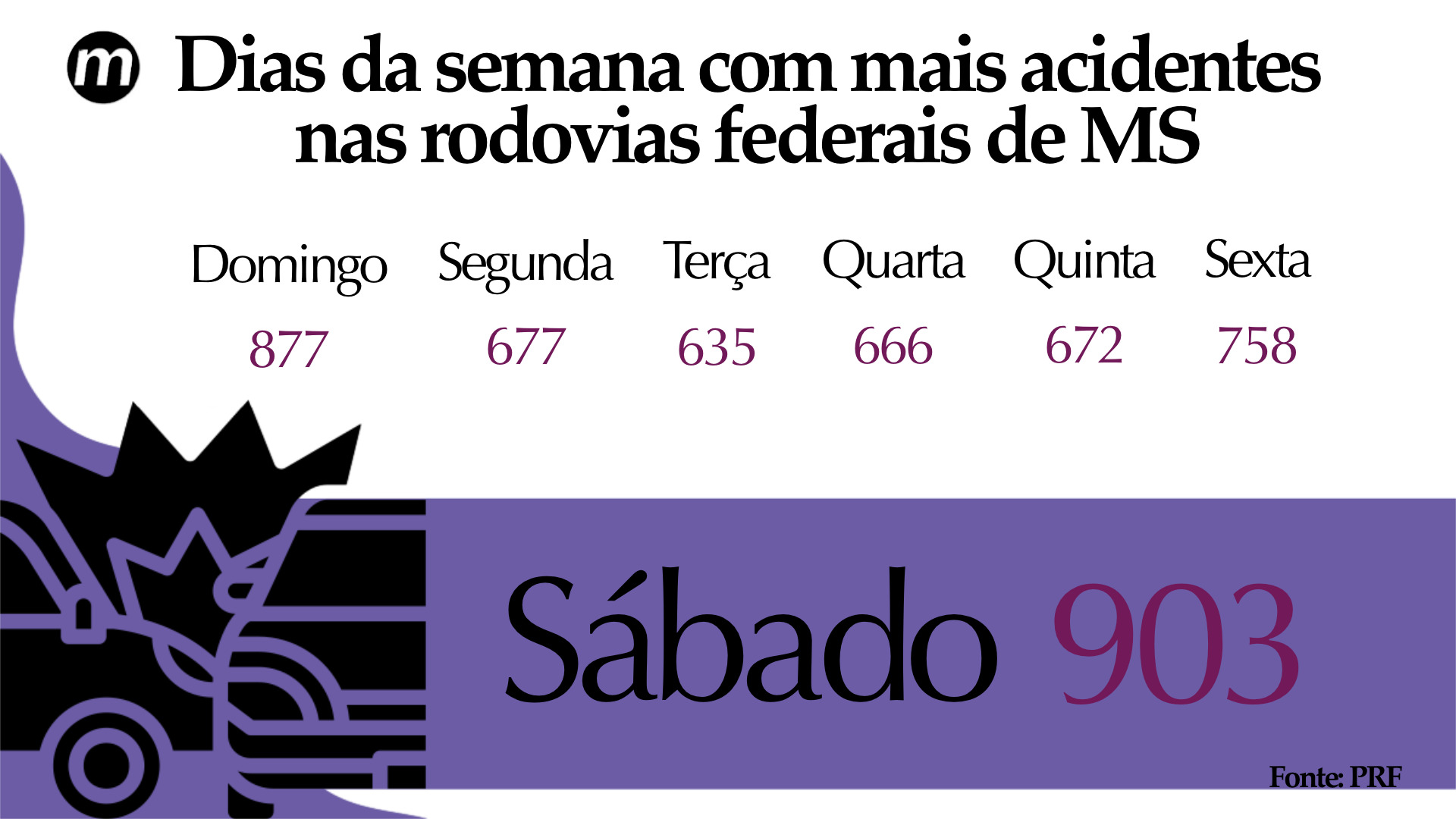 Os dias mais letais no trânsito de Mato Grosso do Sul caem no final de semana, sendo sábado e domingo.