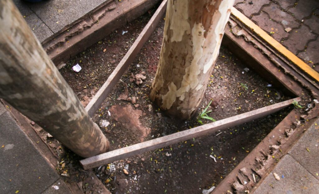 A Sisep (Secretaria Municipal de Infraestrutura e Serviços Públicos), em julho do ano passado, amarrou as árvores em uma estrutura de madeira para sustentar os troncos enquanto crescem. Na época, o órgão afirmou que o procedimento era um manejo de rotina.
