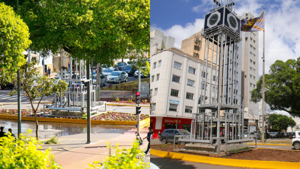 O canteiro do Relógio da 14, no cruzamento com a Avenida Afonso Pena, agora está vazio, com apenas terra no espaço. O visual atual faz um contraste de anos anteriores, que já contou com paisagismo especial para o Natal com plantas rasteiras, palmeiras e arbustos em 2021.