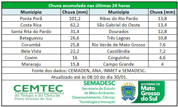 De acordo com levantamento do Cemtec (Centro de Monitoramento do Tempo e do Clima), o acumulado de chuvas nas últimas 24 horas em Ponta Porã foi de 101,2 mm, com ventos de 69,1 km/h. Itaquiraí, no mesmo período, registrou rajadas de 81,4 km/h.