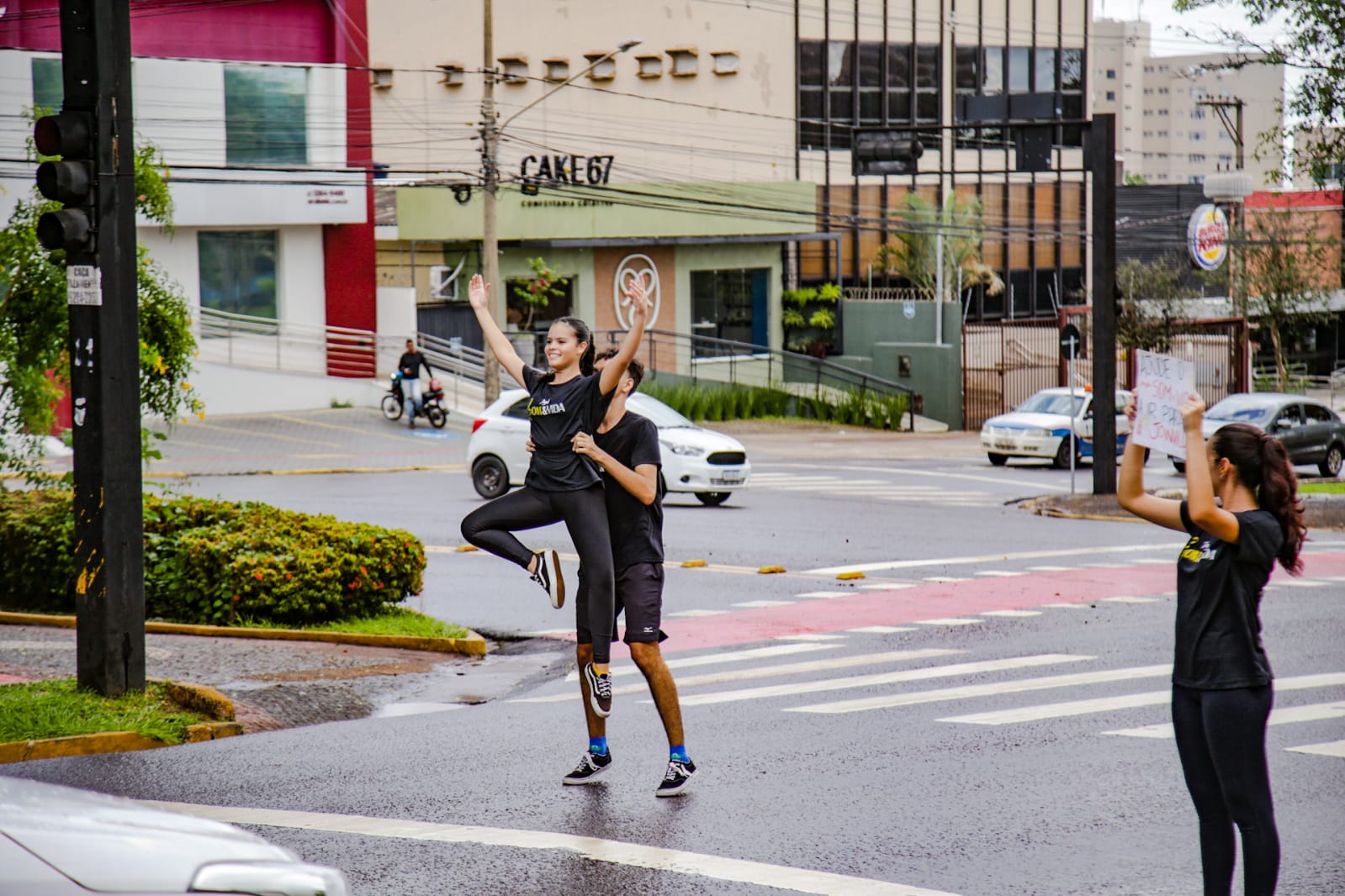 Com passos de ballet e instrumentos musicais, como violino e saxofone, eles prendem a atenção dos motoristas e entregam uma folha de papel com as informações para conhecer o projeto social e como é possível ajudar financeiramente a viagem da turma para Joinville (SC).