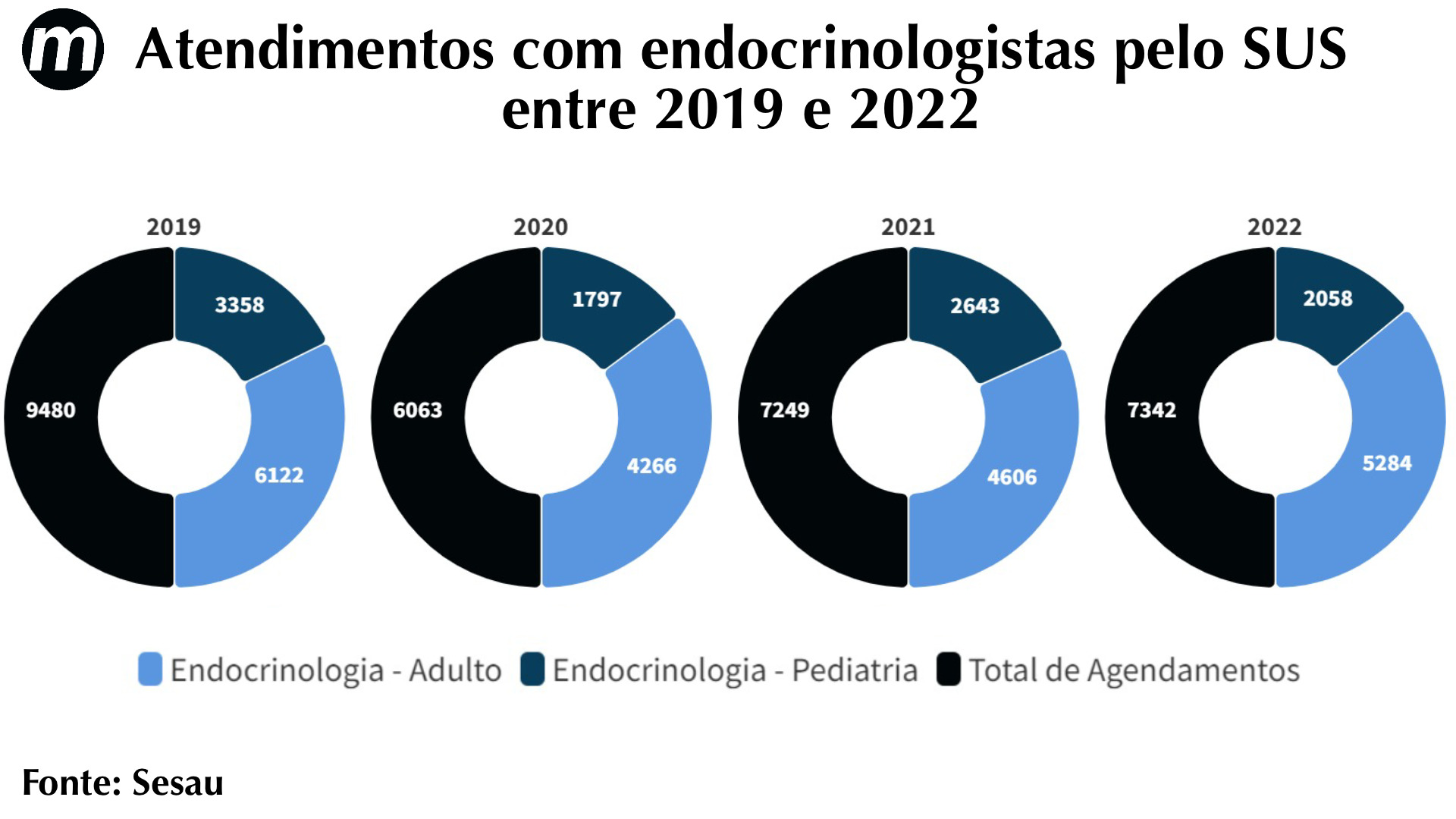 De acordo com dados da Sesau (Secretaria Municipal de Saúde), a Capital tem um médico para atender quase 400 pessoas. São 936 adultos que precisam passar por endocrinologista pela primeira vez e 1.403 que aguardam o retorno, o que resulta em uma demanda de 2.339 pacientes.