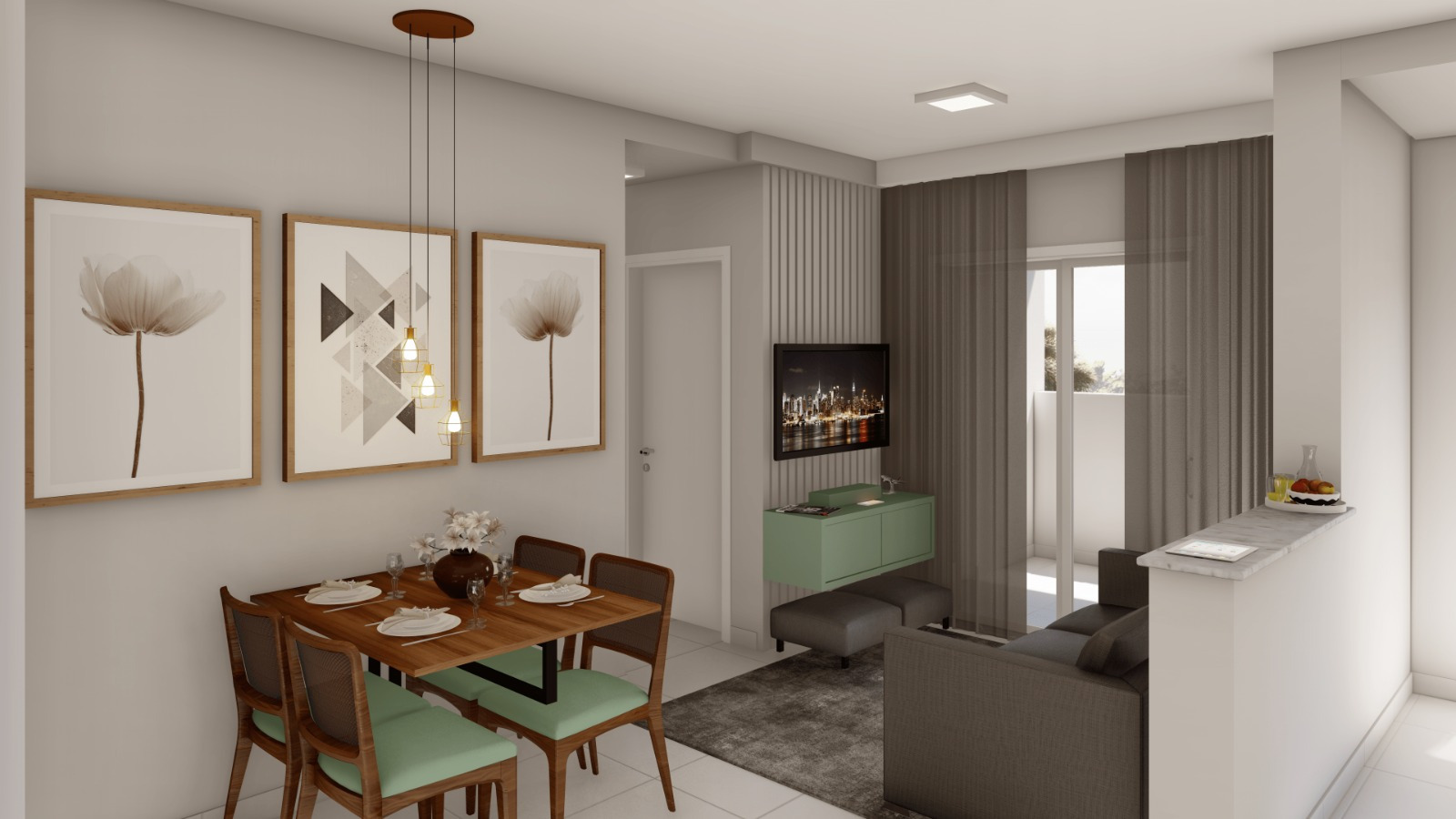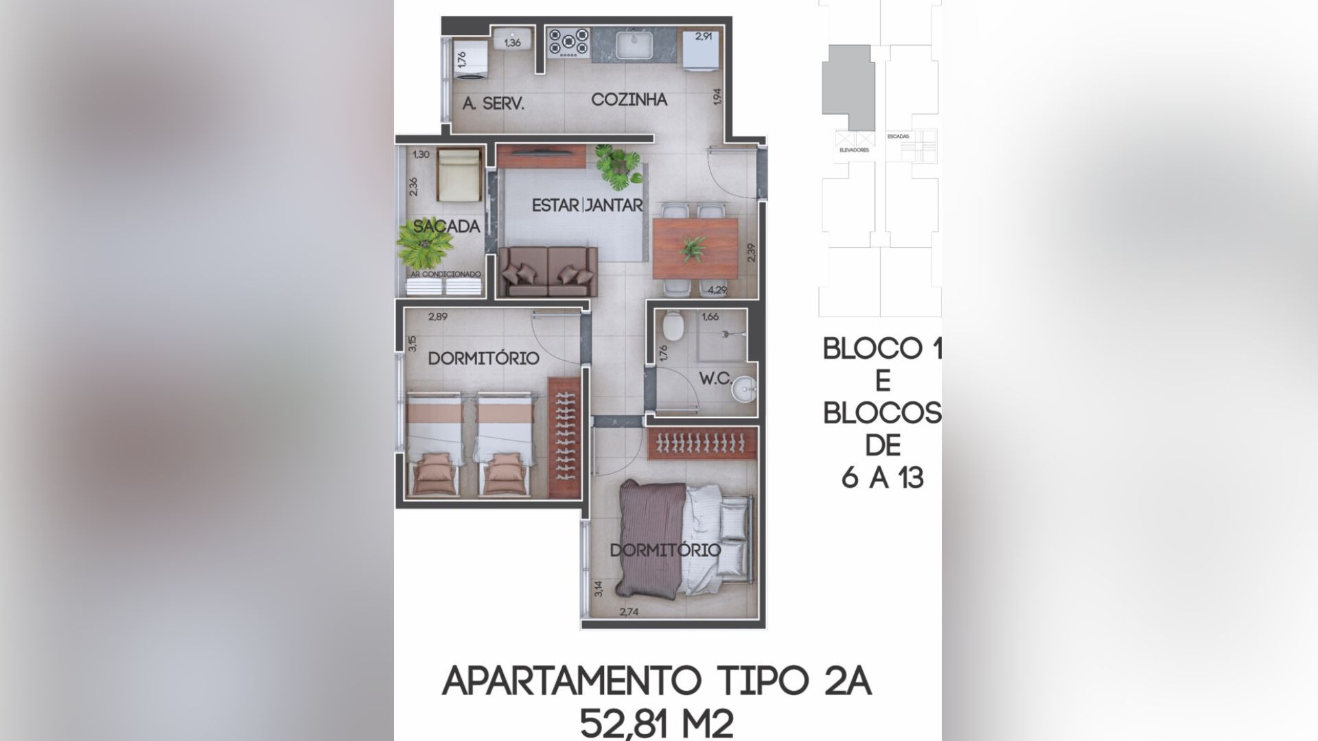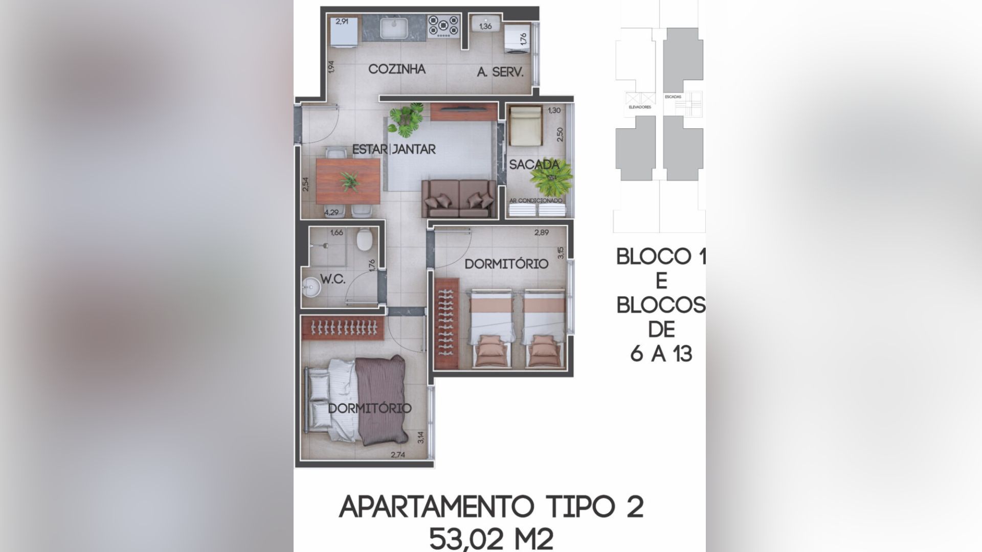 Conforme o projeto, além de dois quartos, cada apartamento terá sala de estar e de jantar conectadas, banheiro, cozinha, área de serviço e sacada. A área total das unidades varia entre 52,71 e 53,02 metros quadrados.