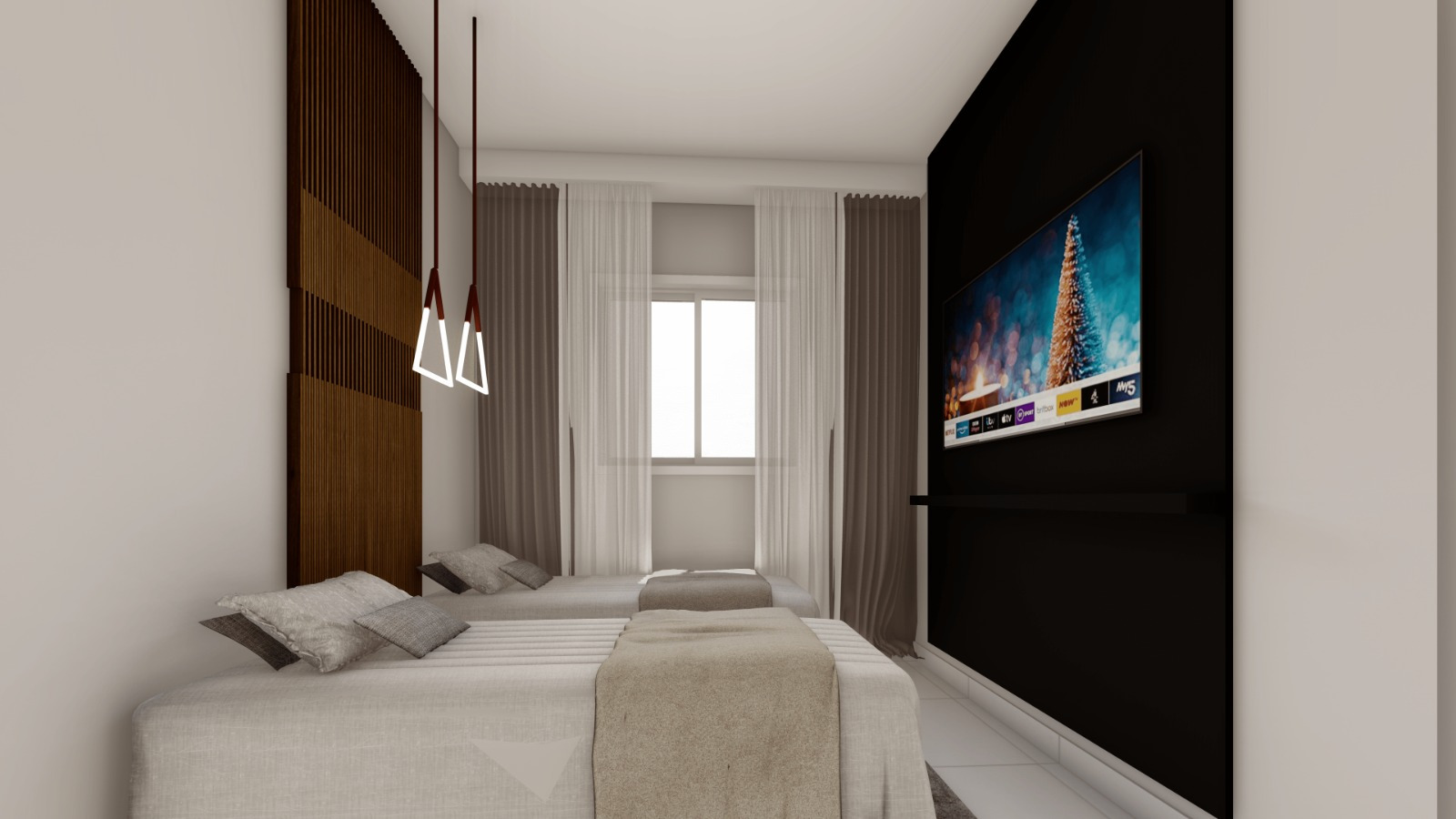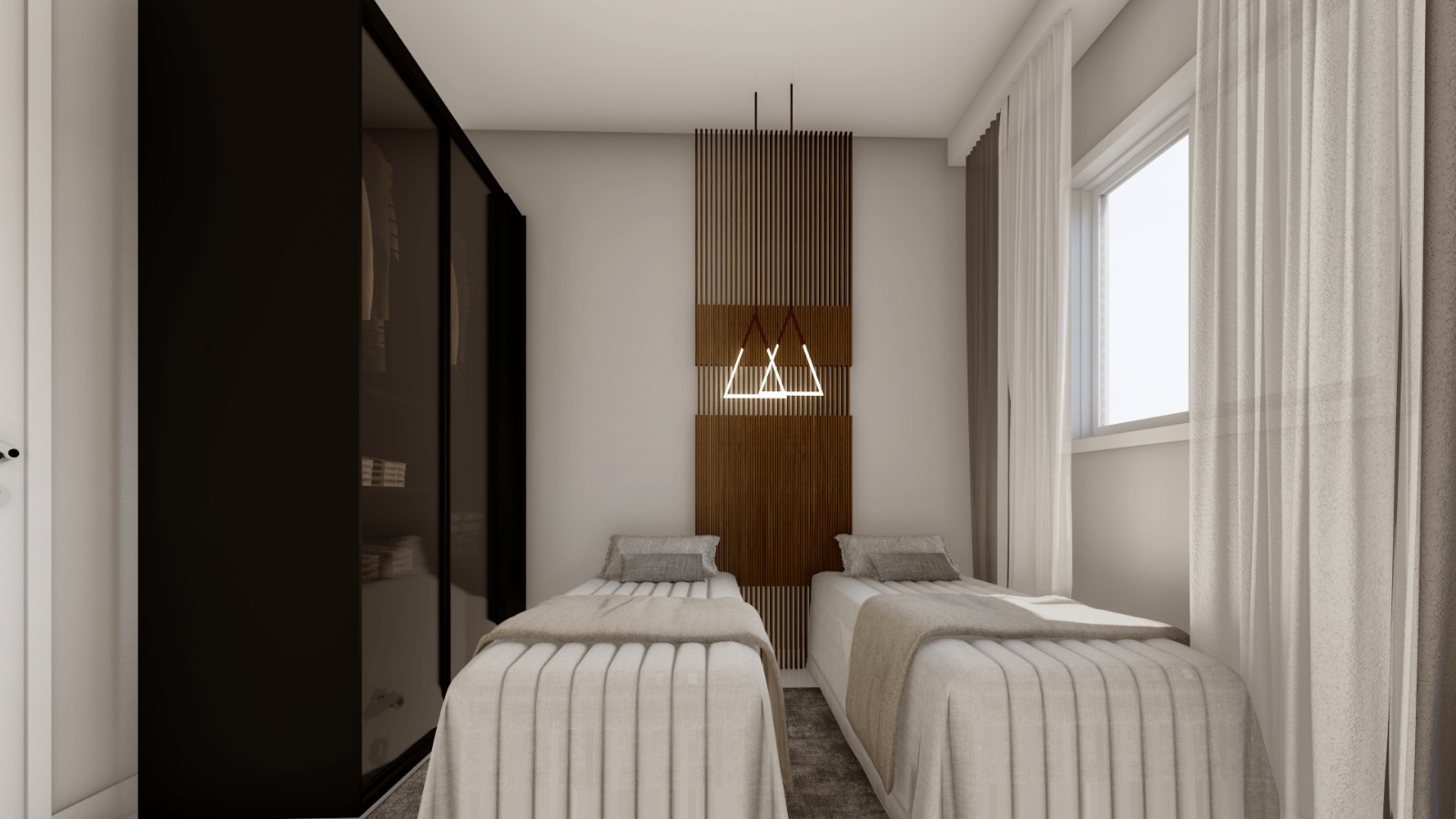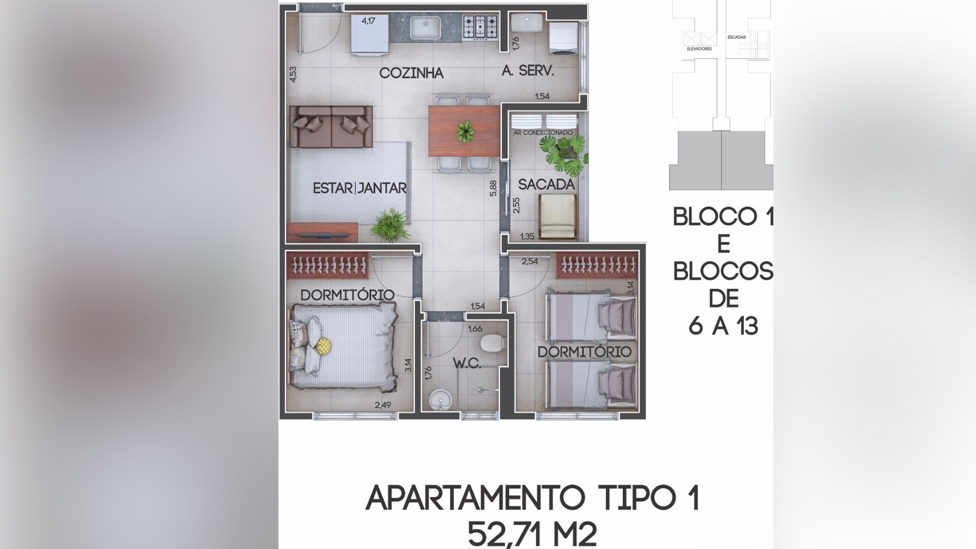 Conforme o projeto, além de dois quartos, cada apartamento terá sala de estar e de jantar conectadas, banheiro, cozinha, área de serviço e sacada. A área total das unidades varia entre 52,71 e 53,02 metros quadrados.