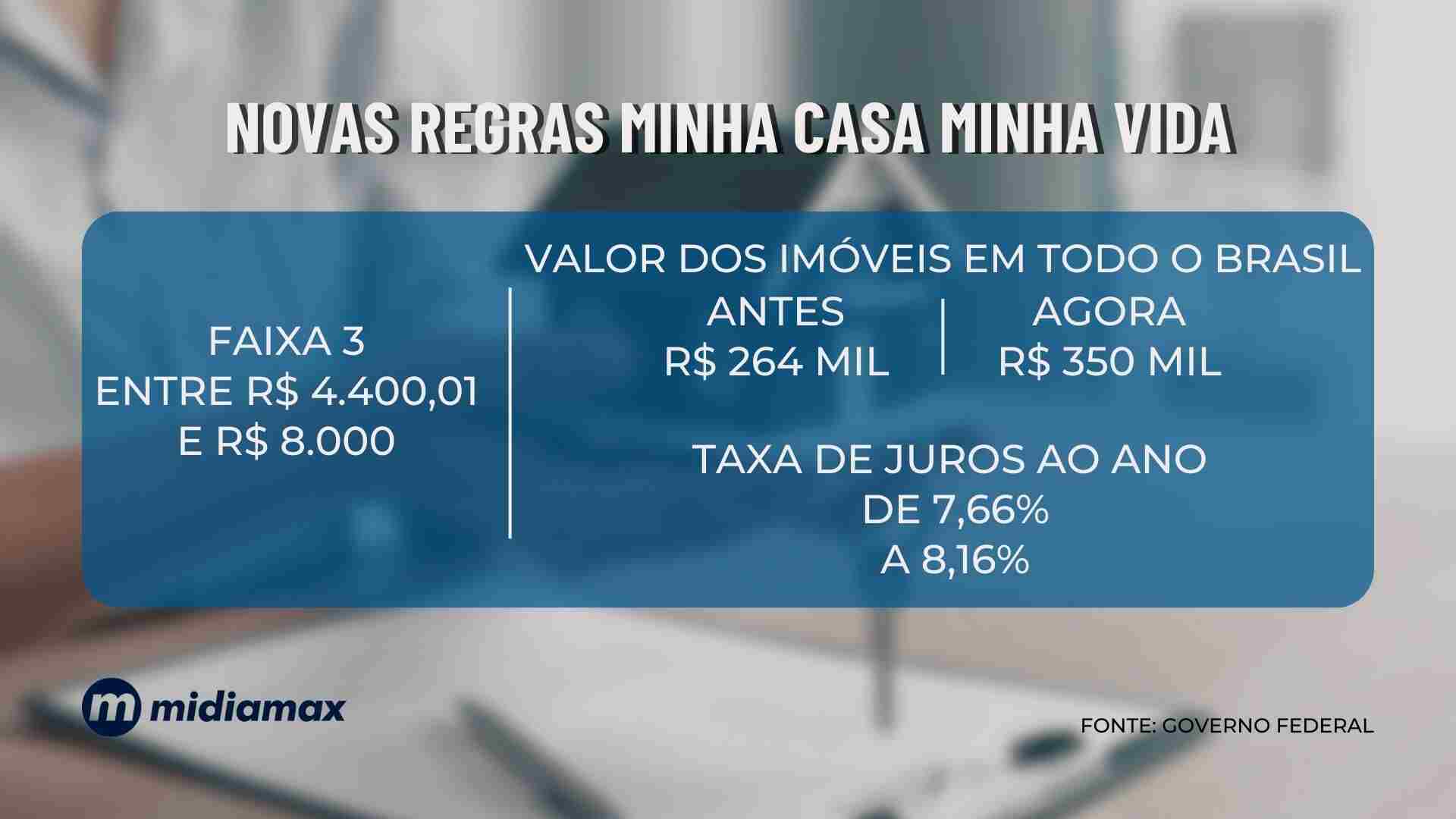 Já para famílias na faixa 3, com renda mensal entre R$ 4,4 mil e R$ 8 mil, não será concedido subsídio do Governo. O grupo poderá financiar imóveis de até R$ 350 mil e os juros são de, no máximo, 8,16% ao ano.