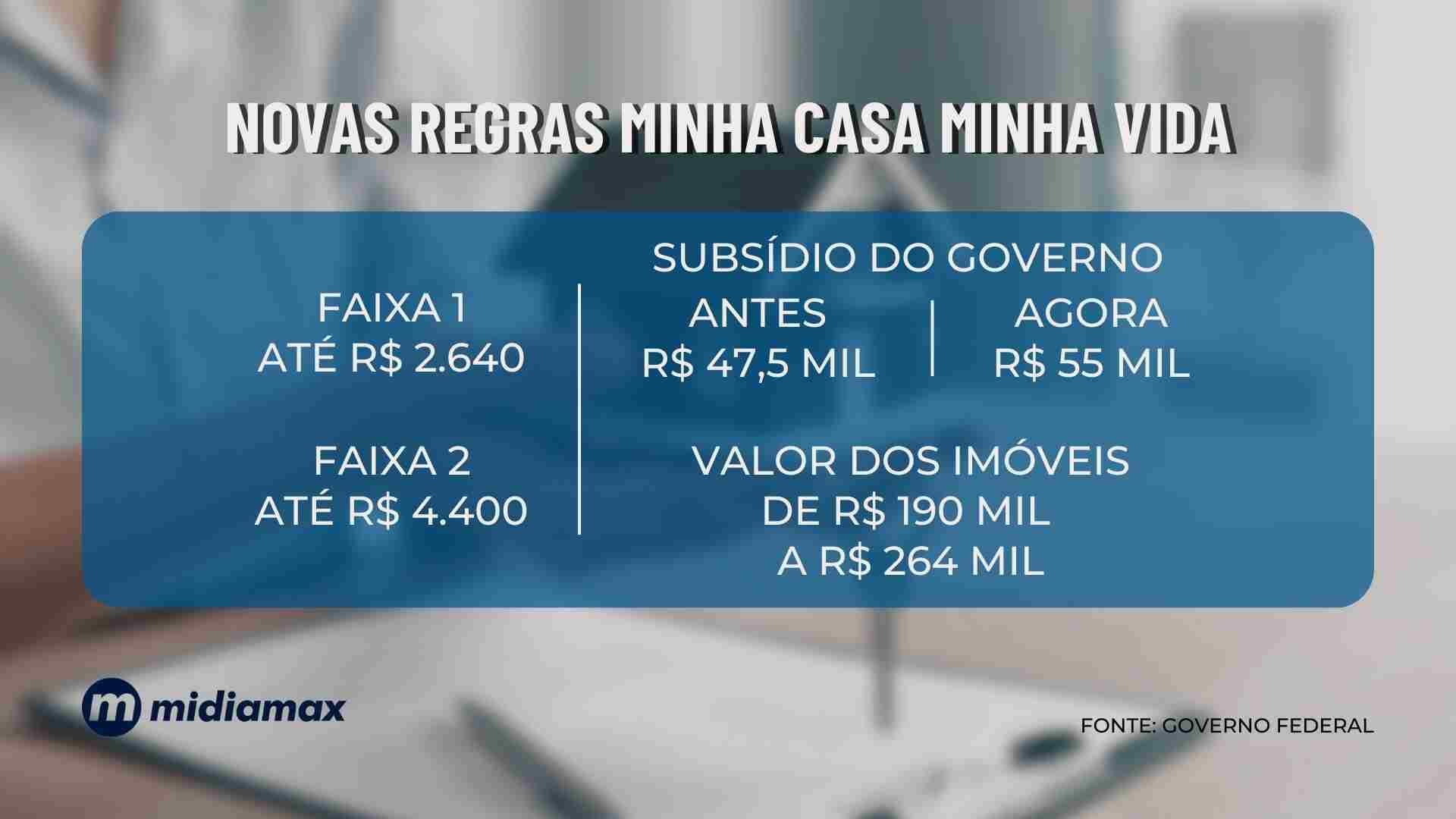 Conforme divulgado pela Caixa Econômica Federal, as novas regras do Programa variam de acordo com a renda das famílias. Na faixa 1, aparece quem ganha até dois salários mínimos, na 2, quem recebe até R$ 4,4 mil por mês.