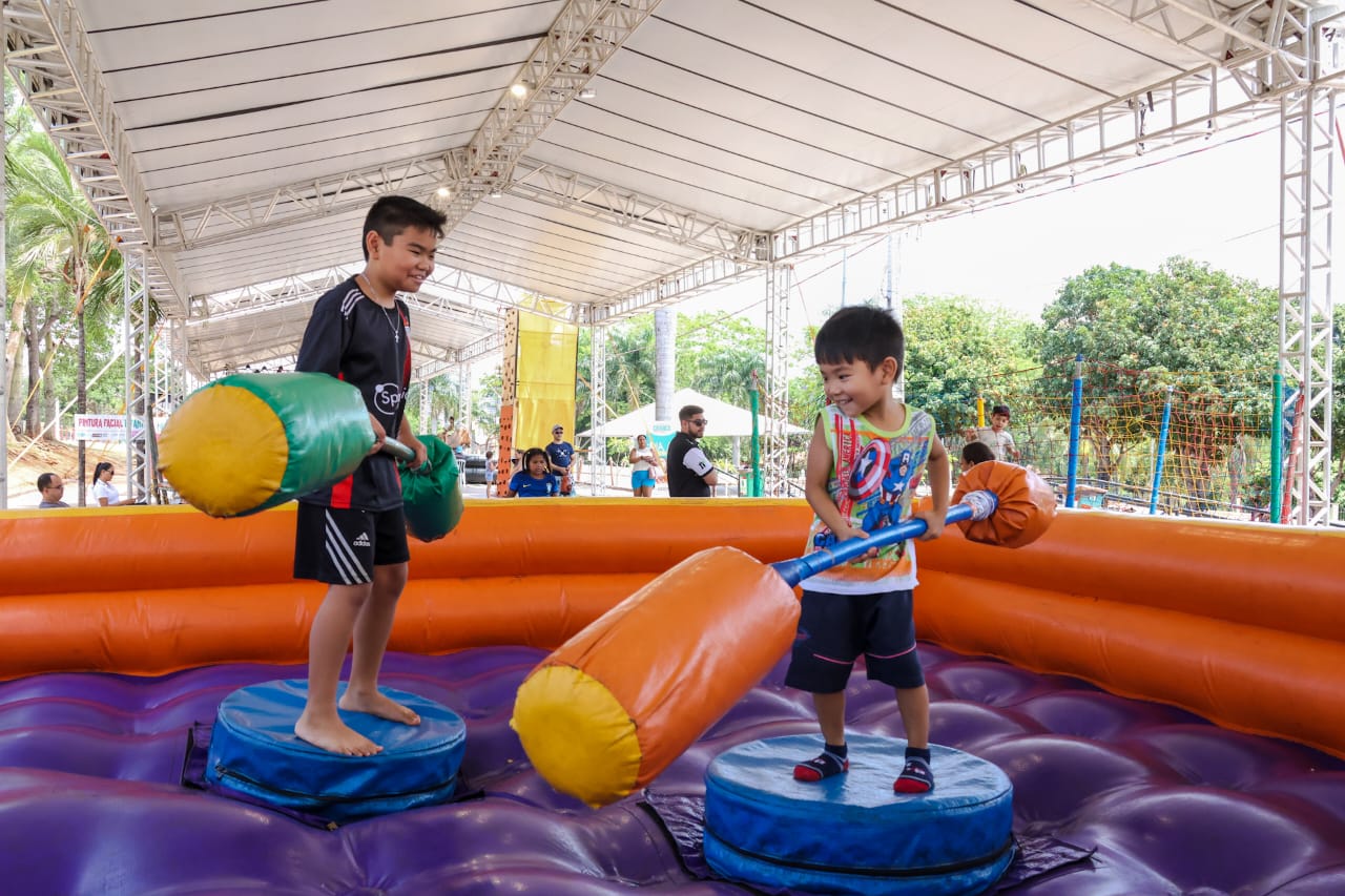 Entre as opções de diversão mais procuradas, está o ‘rapel’, onde uma pequena fila se formou. Outro brinquedo também requisitado pela meninada é a luta na arena inflável, onde registramos os irmãos Lucas, de 10 anos, e o Gabriel, de 4 anos. Eles foram com os pais, Mirian e Wilson Araraki.