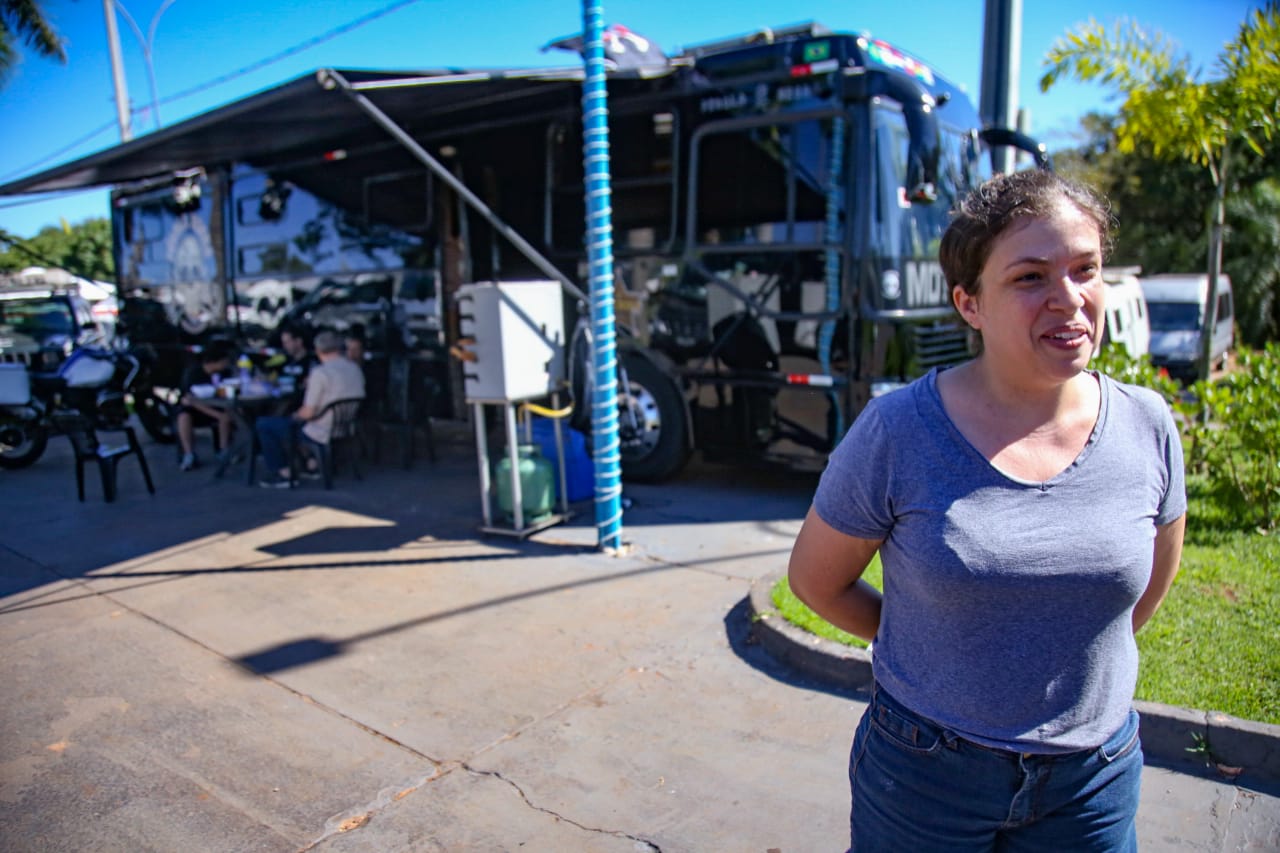 Juliana Caldeira, de 39 anos, a filha de oito anos e o esposo de 46 anos foram até o local matar a curiosidade sobre como é um motorhome por dentro pela primeira vez. A família de Campo Grande conta animada que adora acompanhar viajantes pelas redes sociais, especialmente de grupos que vão para o Alasca.