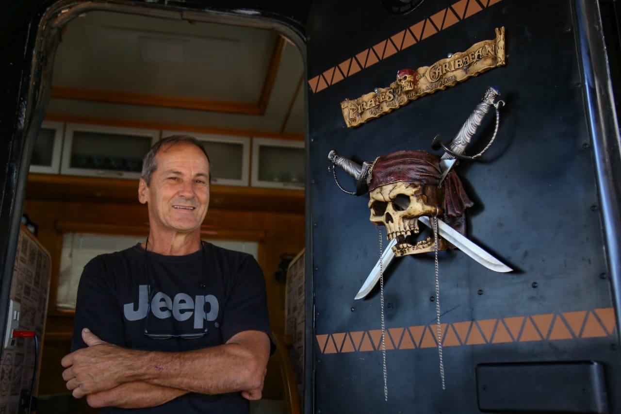Entre os veículos estacionados, um motorhome de 11 metros todo preto chama a atenção pelo cuidado na personalização inspirada no Piratas do Caribe. O “Peróla Negra” de quatro rodas é todo equipado com energia solar, três sistemas de ar-condicionado, câmeras de segurança, móveis planejados, além de um “super porta-malas” em que cabem duas motos, uma bicicleta, um caiaque inflável e os equipamentos de mecânica.