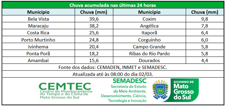 Dentre as cidades onde houve mais chuva nas últimas 24h estão: Bela Vista (39,6), Maracaju (38,2), Costa Rica (25,6), Porto Murtinho (24,8), Ponta Porã (18,2), Amambai (15,6), Coxim (9,8), Angélica (7,8) e Itaporã (6,4).