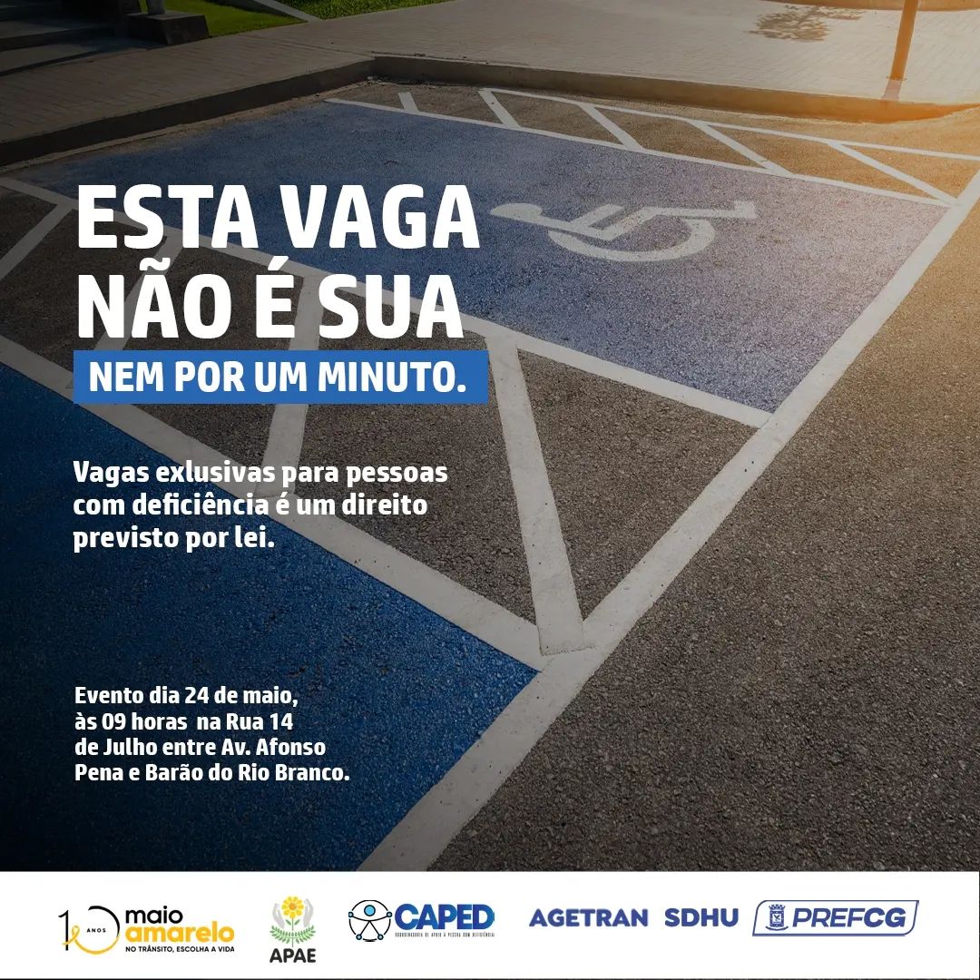 A SDHU (Subsecretaria de Defesa de Direitos Humanos de Campo Grande) irá promover, nesta quarta-feira (24), a ação “Esta vaga não é sua – nem por um minuto”, com o objetivo de conscientizar a população sobre o uso exclusivo da vaga de estacionamento para PCD (pessoas com deficiência) e pessoas idosas.