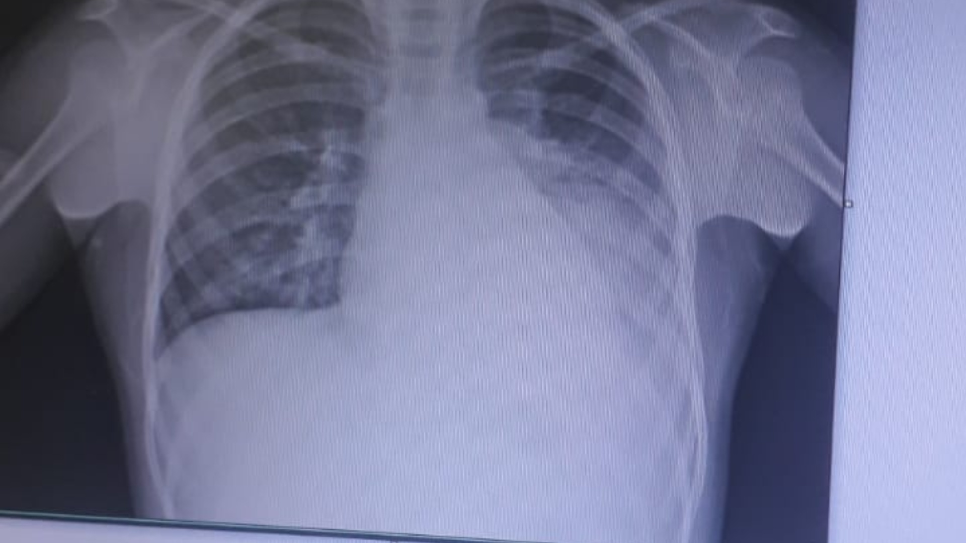 “Não fizeram nenhum raio-x nele. Eu pedi exame, pedi para receitar antibiótico, mas só passaram xarope pra ele”. O exame feito em hospital particular mostra que os pulmões estão comprometidos com uma pneumonia severa.