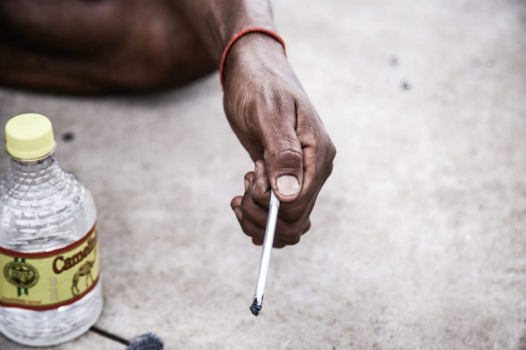 Com mãos que se mexem involuntariamente a todo tempo, ‘Praga’ mostra como prepara o ‘instrumento’ para fumar as pequenas pedras amareladas de pasta base. Na direção da câmera, envolve a droga em um pequeno pedaço de bombril, que depois é posicionado na entrada de um canudo de metal. Na sequência, põe fogo no bombril enquanto puxa a fumaça pela outra ponta.