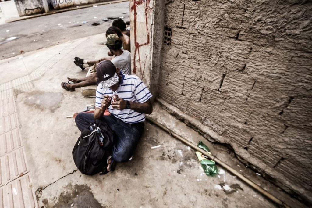 Onde a visão alcança, vai e vem de pessoas com a agitação típica de quem está sob o efeito de drogas, para quem deu “game over” e foi vencido pela exaustão de dias usando pasta base, a proteção para o chão gelado são papelões, lonas e trapos sujos do que um dia foram cobertores e roupas. Por vezes, nem isso.