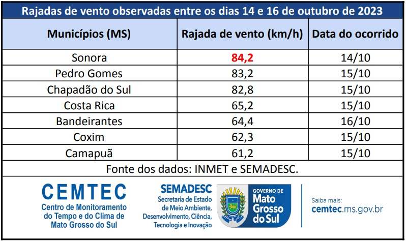 As estações de monitoramento marcaram fortes ventos em Pedro Gomes (83,2 km/h), Chapadão do Sul (82,8 km/h), Costa Rica (65,2 km/h), Bandeirantes (64,4 km/h), Coxim (62,3 km/h) e Camapuã (61,2 km/h).