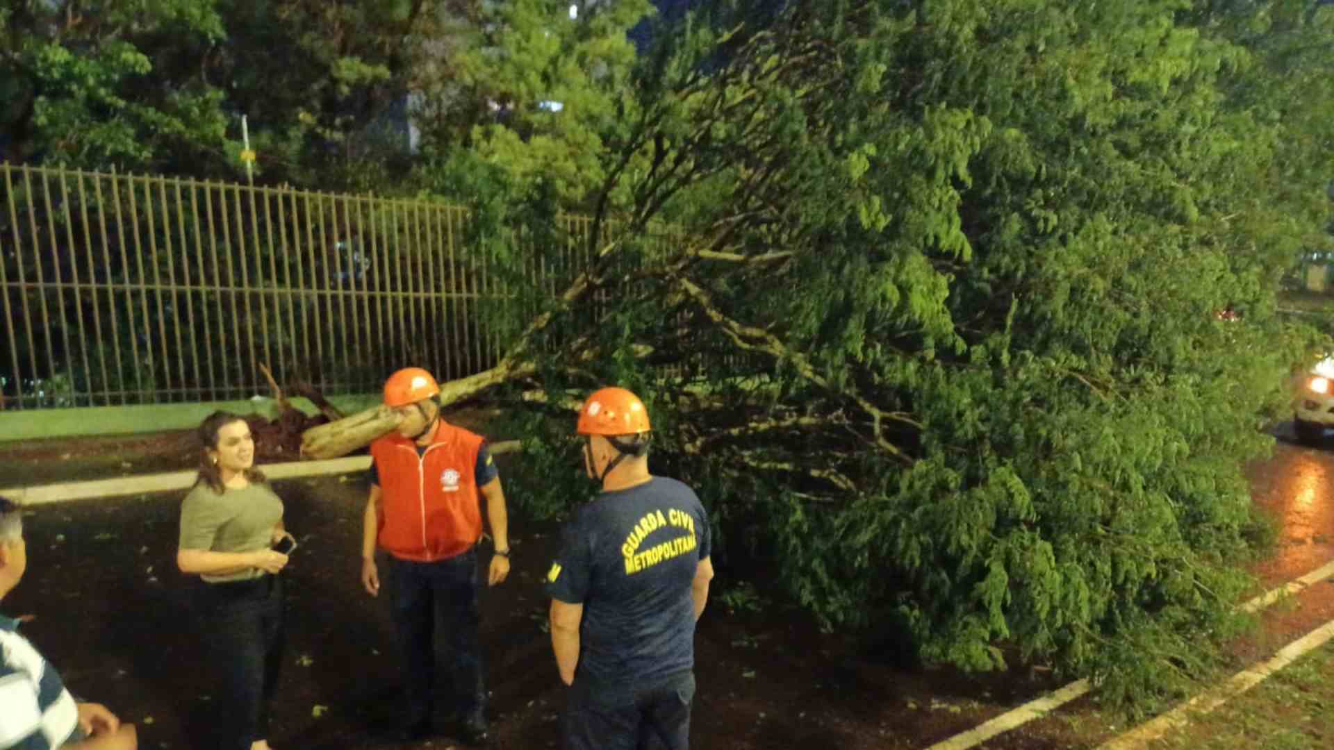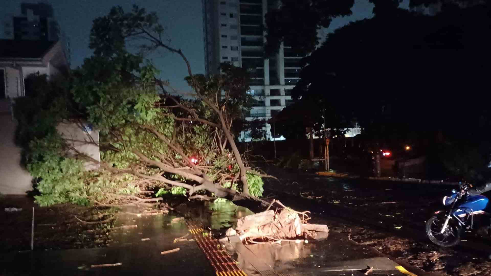 No Jardim dos Estados, o estrago foi intenso. Árvore caiu na Rua Bahia, quase com a Afonso Pena, na 15 de novembro também. Na Avenida Fernando Correa da Costa, ainda na altura do bairro, até uma placa foi parar no meio da via. Tapumes de obra de um edifício também caíram.
