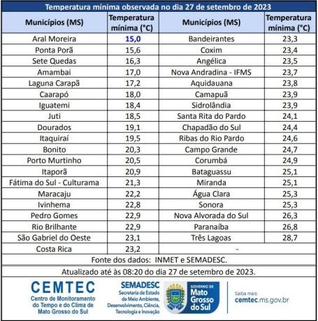 Outras regiões enfrentam contraste, enquanto Aral Moreira registra mínima de 14,7°C, Paranaíba ainda mantém calor de 39°C. Ainda conforme a previsão, ao longo do dia deverá avançar para outras regiões do Estado e deverá ocorrer o que chamamos de “mínima invertida”.