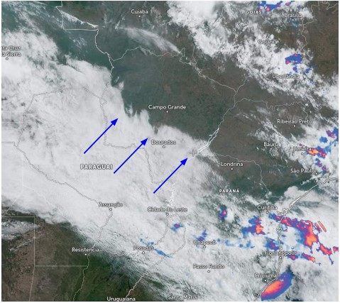 O monitoramento de satélite desta quarta-feira mostra céu limpo no centro-norte do Estado, porém apresenta um tom acinzentado no céu devido à presença de fumaça. Na metade sul, há presença de nuvens devido à aproximação de uma frente fria.