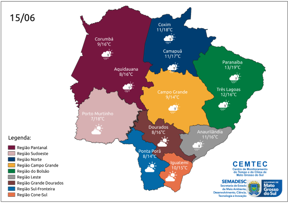 Até o fim de semana, a previsão indica chuvas de intensidade fraca a moderada. As mínimas variam de 7°C a 11°C e a máxima entre 16°C e 18°C na região pantaneira, norte, leste e centro-sul. As maiores temperaturas são registradas no bolsão, como em Três Lagoas, com máxima de 19°C.