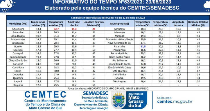 Paranaíba (11,8°C), Água Clara (13,4°C), Camapuã (14,6°C), Amambai (14,9°C), Chapadão do Sul (15°C), Costa Rica (15,1°C) e Coxim (16°C). tiveram as menores temperaturas. No mesmo dia, o calor registrou variação de 26°C a 32,7°C.