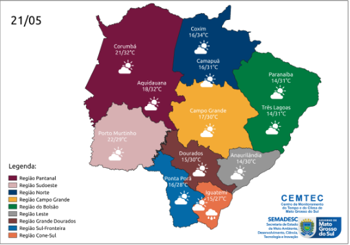 No sábado (20), o cenário não é diferente. A previsão indica elevação da temperatura na região pantaneira, bolsão e norte. Porto Murtinho, Corumbá, Aquidauana, Coxim e Três Lagoas devem registrar máximas entre 30°C e 34°C.