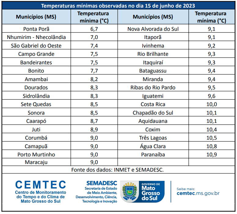 As temperaturas observadas em 30 cidades mostram que as mínimas variam entre 6°C e 10°C, conforme o Cemtec (Centro de Monitoramento do Tempo e do Clima). A fronteira registra frio congelante, com sensação térmica de 0,3°C, conforme a estação do Inmet (Instituto Nacional de Meteorologia).