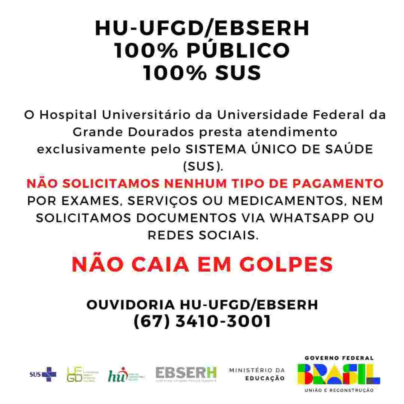 “Não solicitamos nenhum tipo de pagamento por exames, serviços ou medicamentos, nem solicitamos documentos via WhatsApp ou redes sociais. Não caia em golpe”, diz um post publicado pela Ebserh (Empresa Brasileira de Serviços Hospitalares) em Dourados.