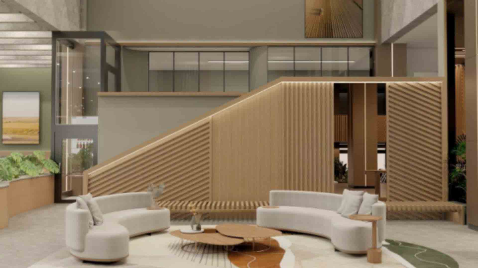 O hall de entrada tem escadarias, continuidade até a recepção dos tons em verde e madeira, lustres e móveis no lobby. Mármores devem dar destaque na bancada da recepção. Haverá um bar e área de espera, com móveis modernos, estilo “novelas e filmes”, com a adega repleta de bebidas e um balcão.