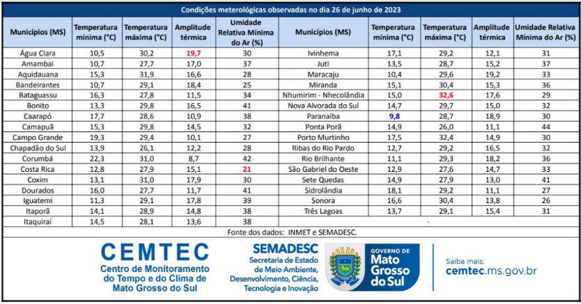 O monitoramento indica amplitude térmica, que é a diferença entre máxima e mínima, nas últimas 24h. Água Clara amanheceu com mínima de 10,5°C, mas a evolução na temperatura chegou a 30,2°C, pontuando amplitude de 19,7°C; Nhecolândia, em Corumbá, registrou mínima de 15°C e os termômetros chegaram a 32°C; em seguida está Aquidauana com mínima de 15°C e máxima de 31°C no mesmo dia.