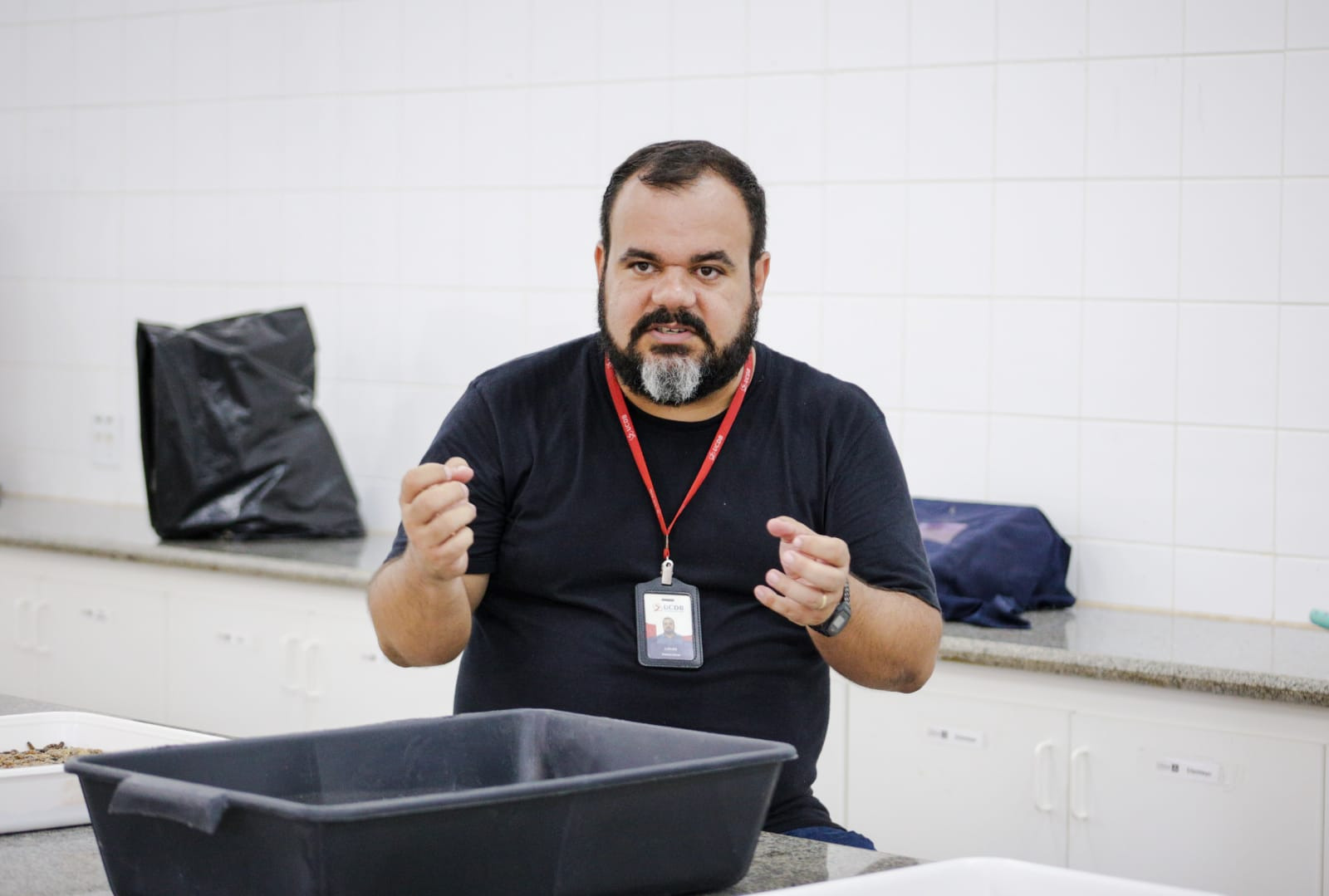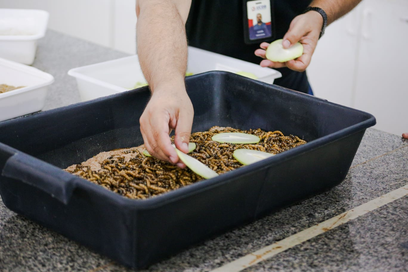 “Nós criamos duas espécies, o tenébrio comum e o gigante. A partir da produção, surgiu a ideia de avaliar outras formas de alimentar essas espécies, que têm como base de alimentação o farelo de trigo”, explica Lucas