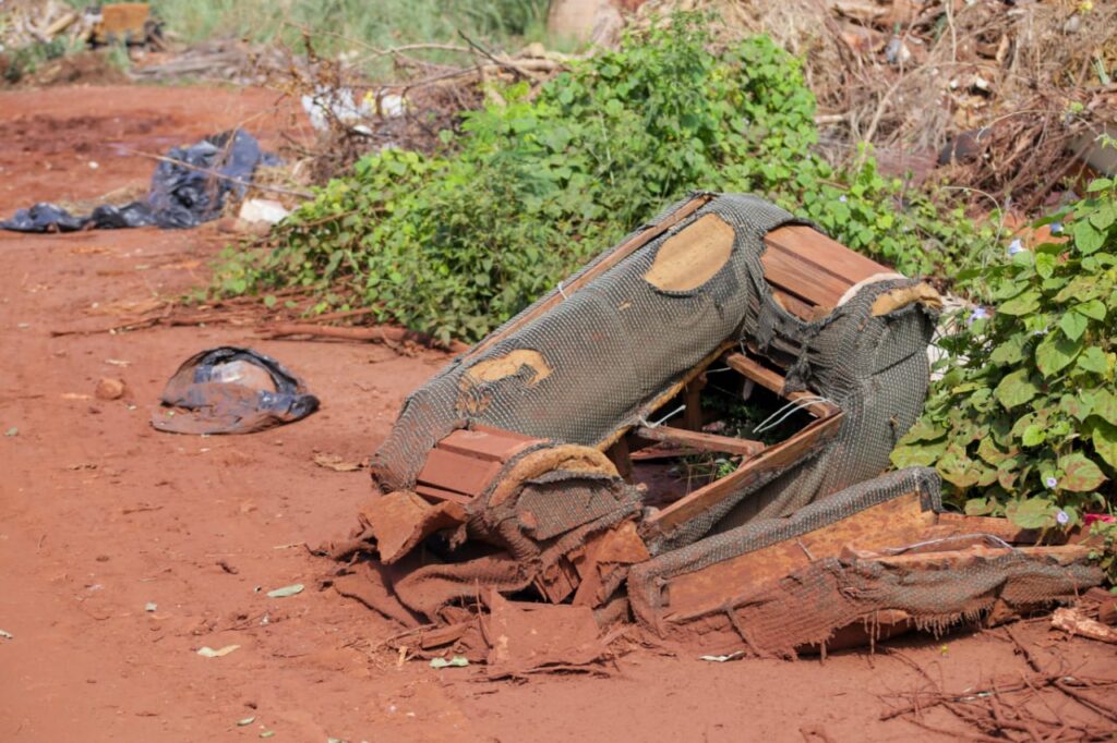 Entulho de construção, piso, telhas, roupas, sofás, colchões, embalagens de marmitas, pneus, vasos, pias, galhos de árvores, brinquedos são alguns dos materiais despejados dos dois lados da via que fica aos fundos da construção de um novo condomínio.