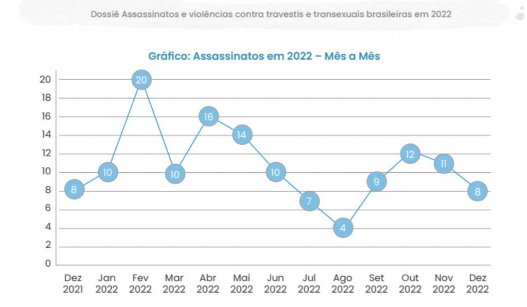 No Brasil, um total de 131 assassinatos foram registrados, 61% das mortes de pessoas trans ocorreram no primeiro semestre. O mês mais letal para o público foi o mês de fevereiro, com 22 mortes registradas. A média de assassinatos por mês contra pessoas trans foi de 11.