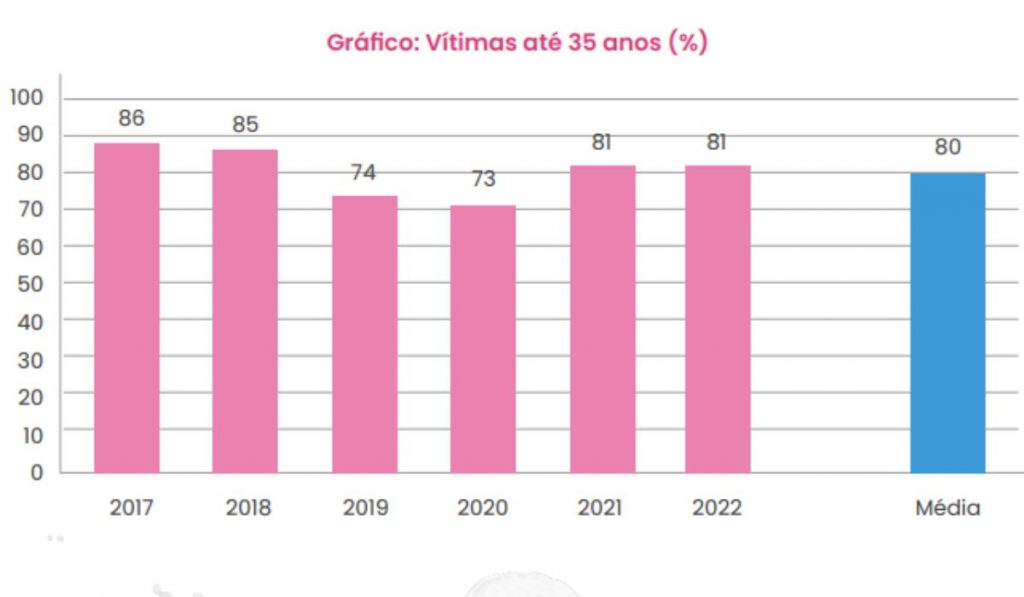 O estudo mostra que a maioria das vítimas são pessoas com idades entre 15 e 35 anos, daí a expectativa de vida. Em 2017, 86% das vítimas tinham entre 16 e 35 anos. Já em 2018, tivemos 85% entre 17 e 35 anos. Em 2019, apresentou 74% das vítimas entre 15 e 35 anos; 2020 teve 73% dos casos entre 15 e 35 anos e; 2021 com 81% entre 13 e 35 anos. Já em 2022, tivemos 81% das vítimas entre 15 e 35 anos.