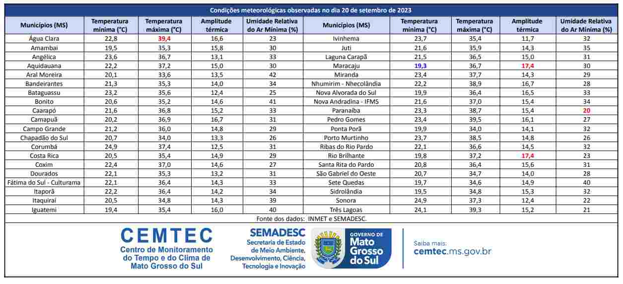 As condições meteorológicas observadas na quarta-feira (20), volumes consideráveis em Bandeirantes (27,8 mm), Dois Irmãos do Buriti (18 mm), Sete Quedas (15,6 mm), Iguatemi (15 mm), Campo Grande (14,4 mm), Miranda (10,2 mm) e Pedro Gomes (9,6 mm).